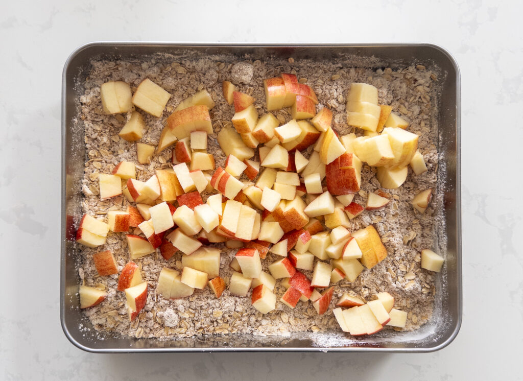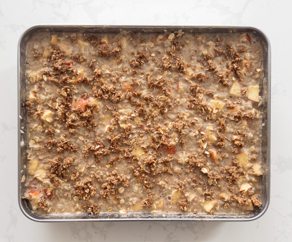 For the streusel, blend the oats with zero-calorie sweetener and cinnamon, then add in the melted light butter and stir to combine until it forms a crumbly topping. Spread this over the apple pie oats.