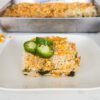 Add in the steamed cauliflower rice and combine. Spread the mixture evenly into the prepared baking dish.
