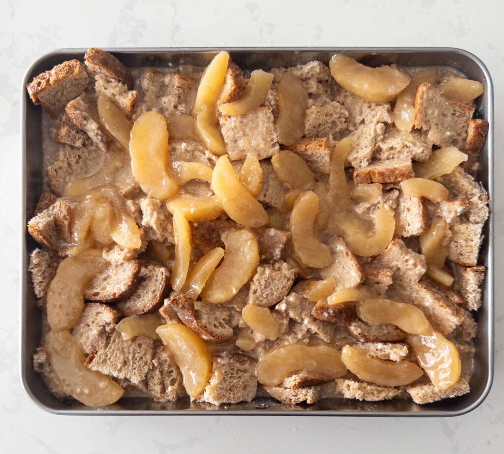 Pour the mixture over the bread, ensuring all pieces are coated. Push down gently with a fork if needed to ensure all the bread is covered.