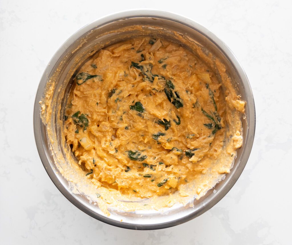 In a separate bowl, combine the chicken, onion, egg, and spinach with the remaining sauce mixture.