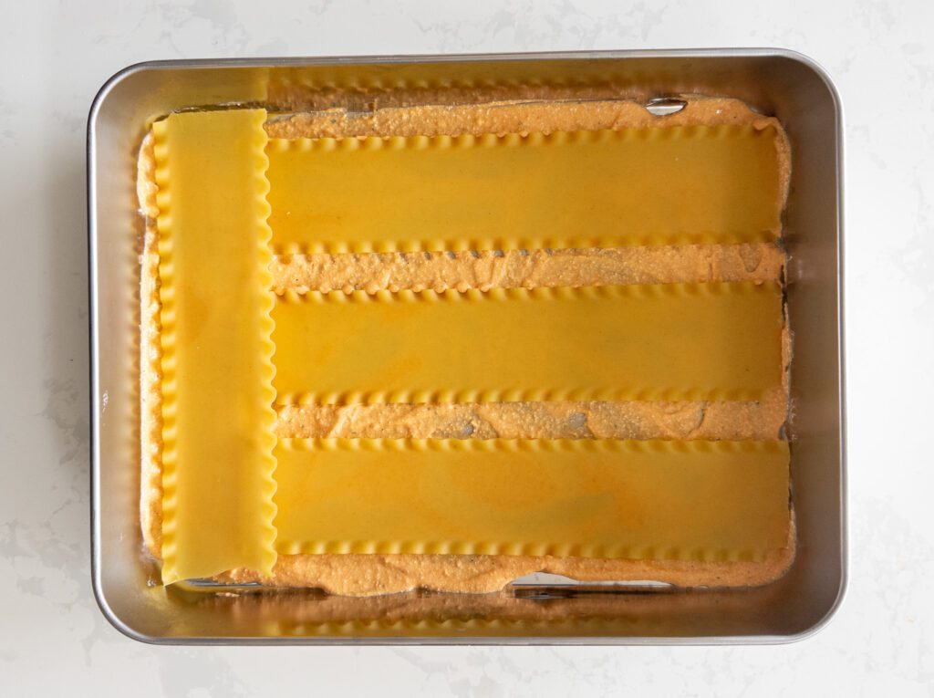 • Spread a thin layer of the sauce mixture on the bottom of a 9×13 inch casserole dish.