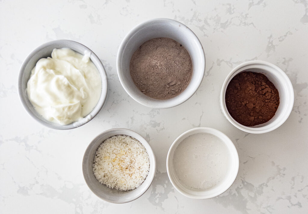 In a mixing bowl, combine the plain Greek yogurt, chocolate protein powder, cocoa powder, 10g (2/3) of the shredded coconut and coconut flour. Mix well until the protein powder is fully incorporated.