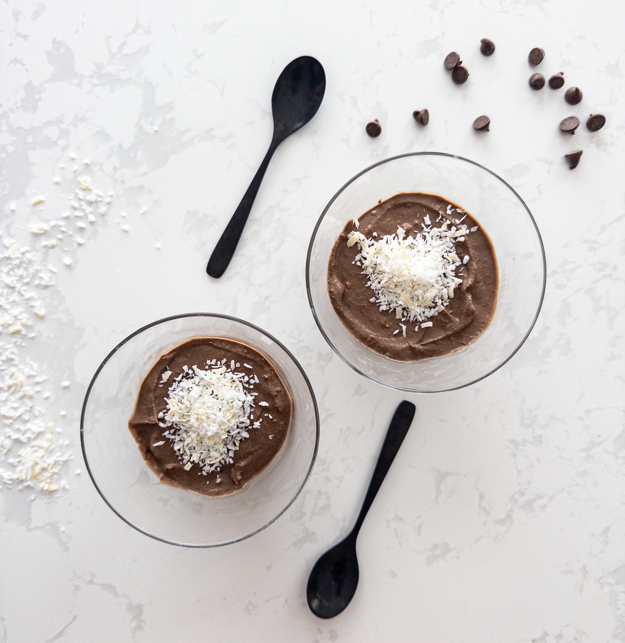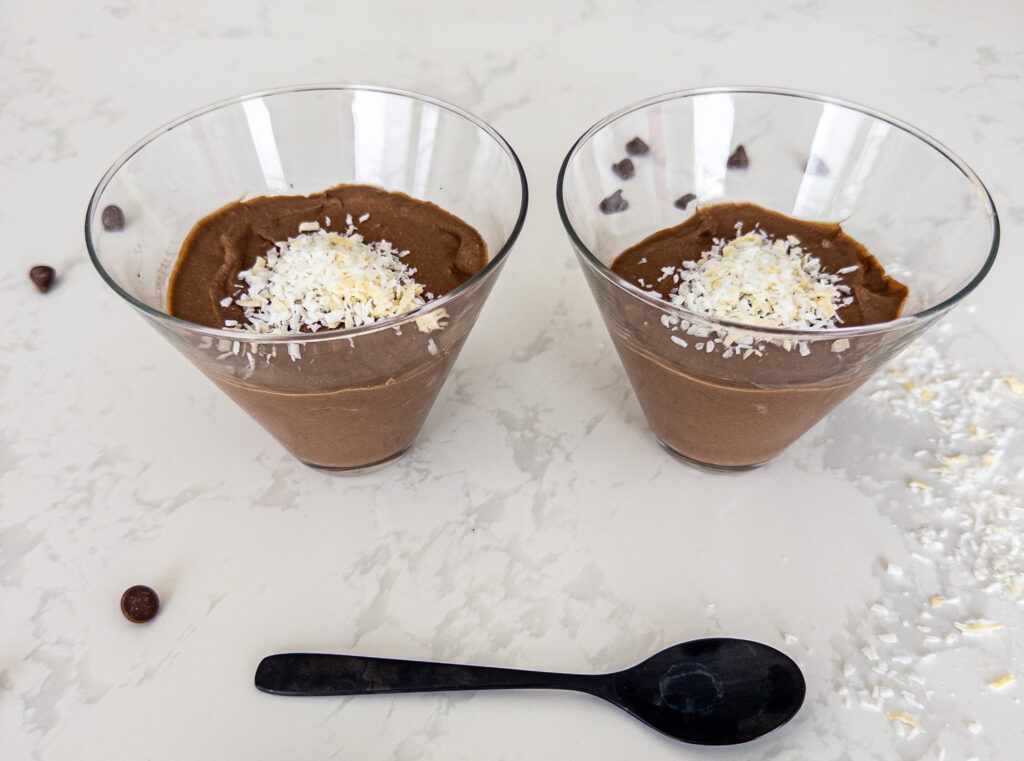 Once chilled, give the mousse another good stir. Divide the mousse between two dessert bowls or glasses. Top with remaining shredded coconut, and optional shredded dark chocolate shavings (not included in macros)
