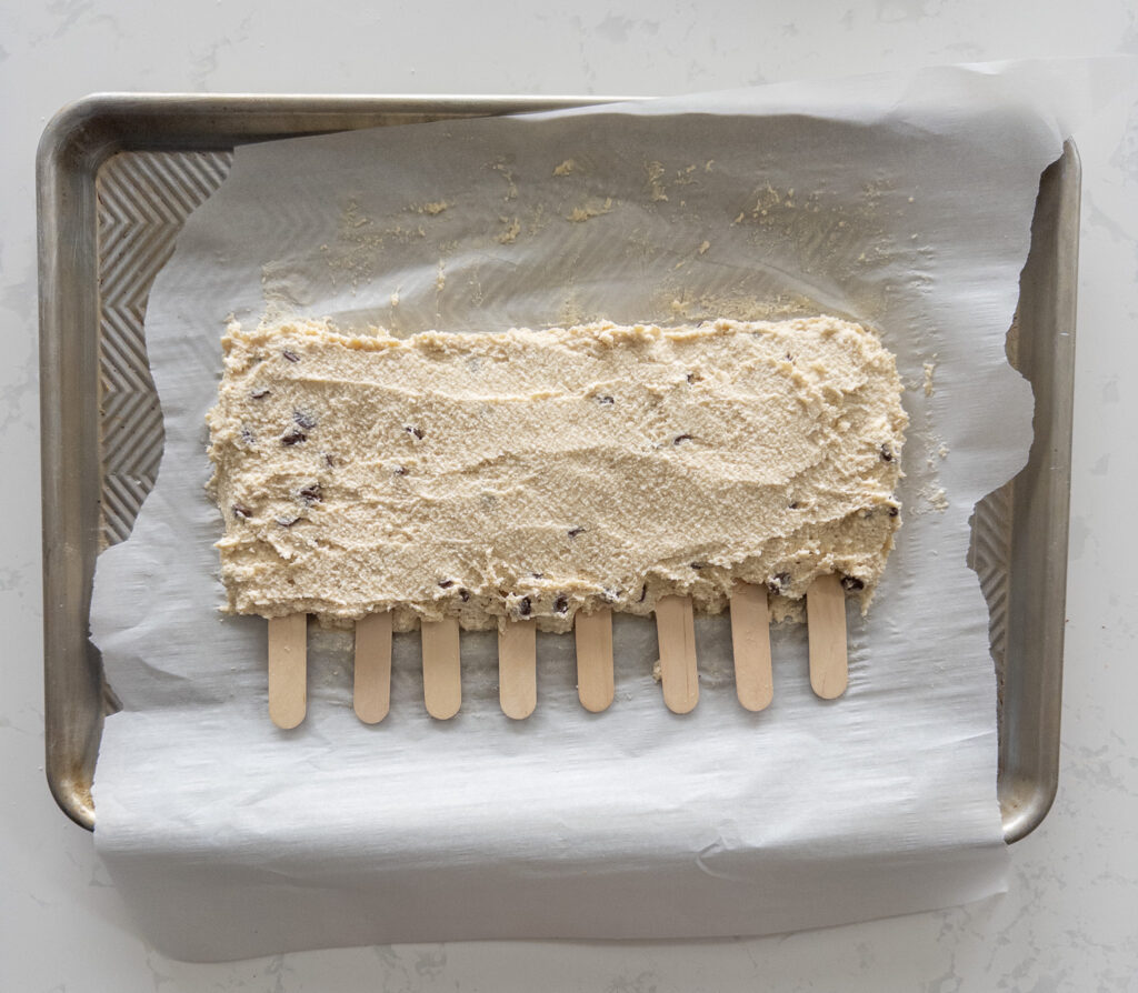 Spread the cookie dough mixture evenly into the lined baking dish, smoothing the top with a spatula. To make 8 servings, I recommend making the dough 1 inch thick and 5 inches wide by 12 inches long. Insert popsicle sticks into the cookie dough at regular intervals, ensuring they are firmly anchored.