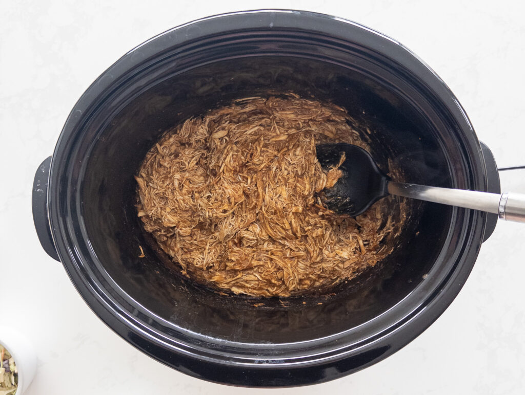 • Return the shredded chicken to the crockpot, mixing it well with the sauce.