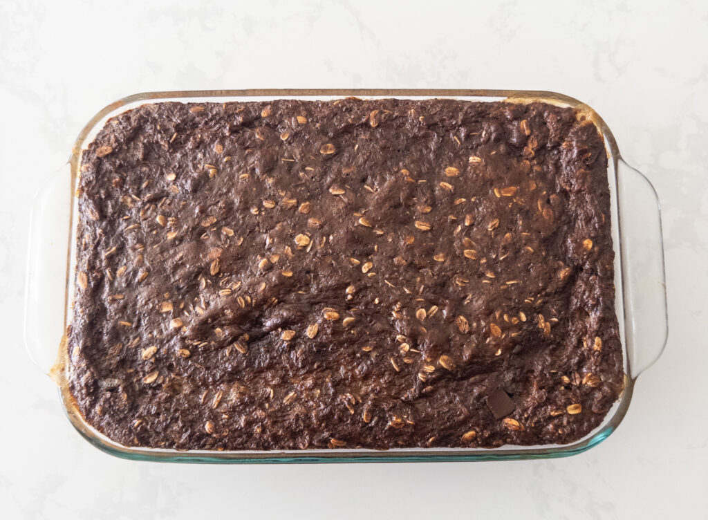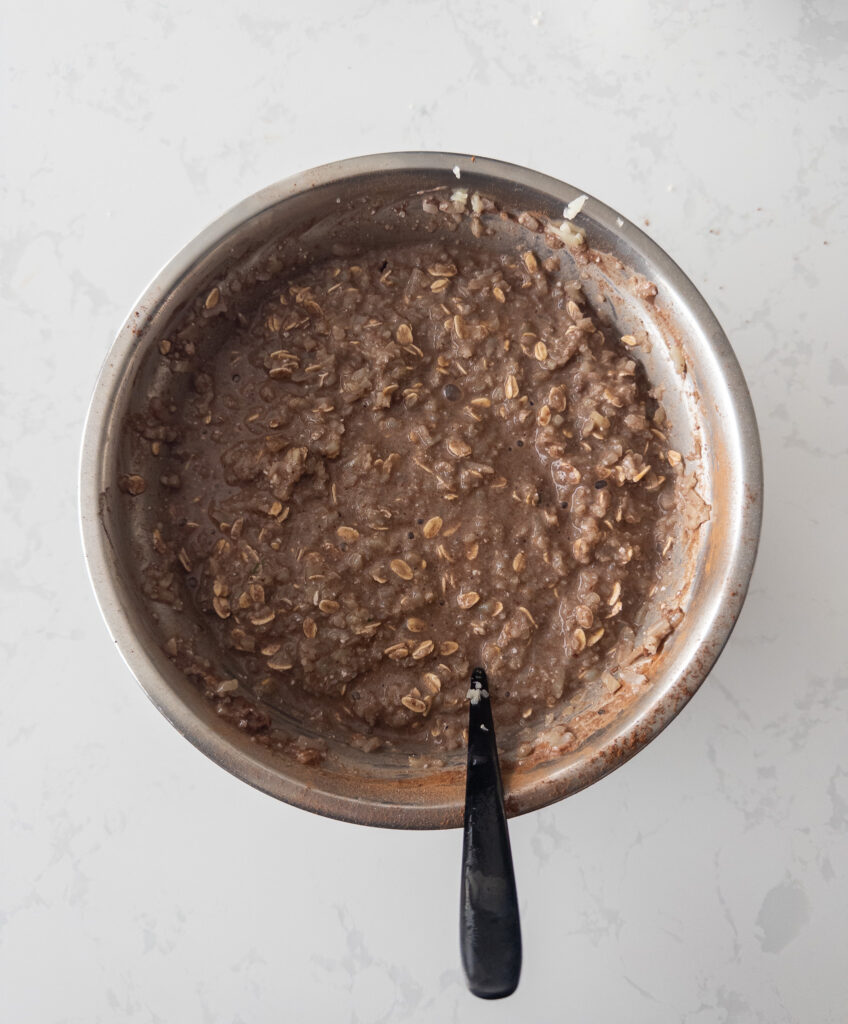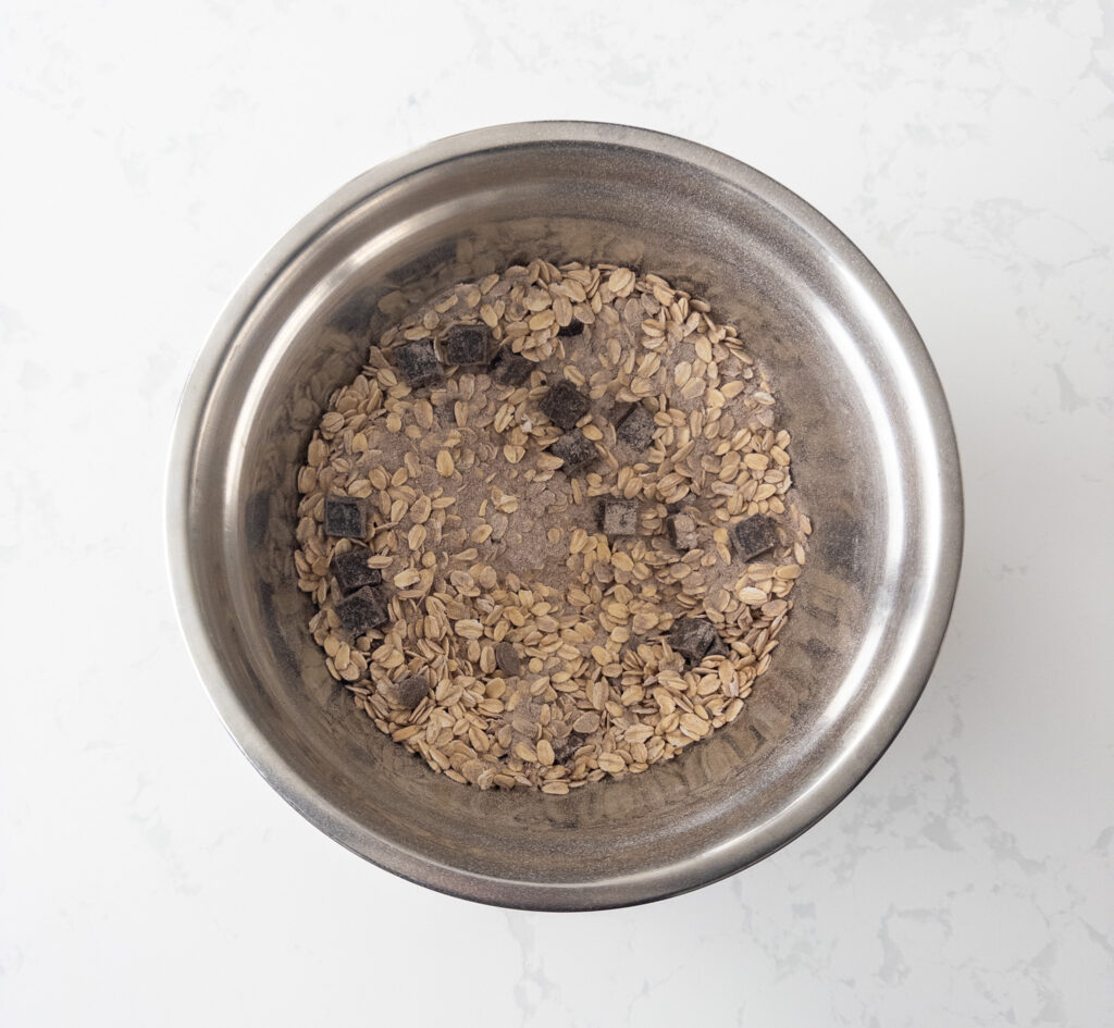 In a large mixing bowl, combine the oats, chocolate protein powder, ground flaxseed, brown sugar substitute, cocoa powder, baking powder, salt, and dark chocolate chips.