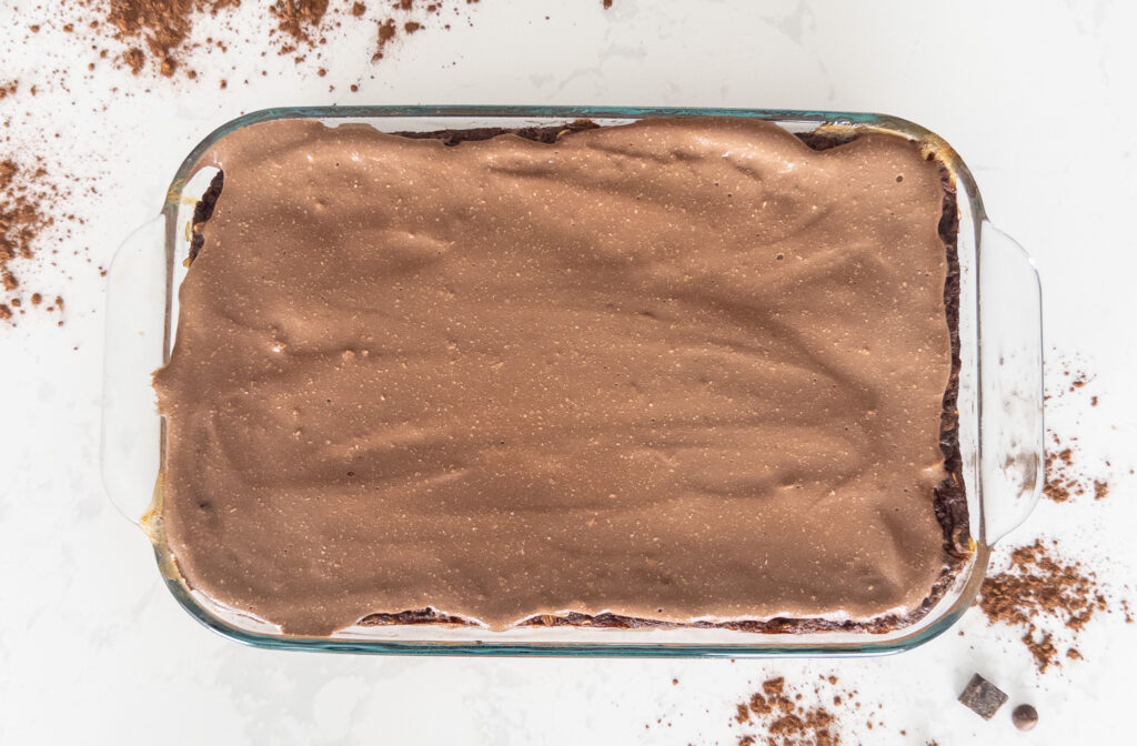 Once the bars are cooled, spread the chocolate icing evenly over the top.