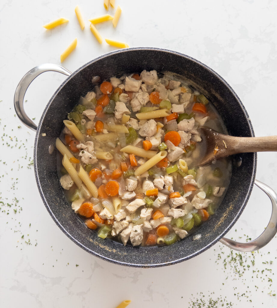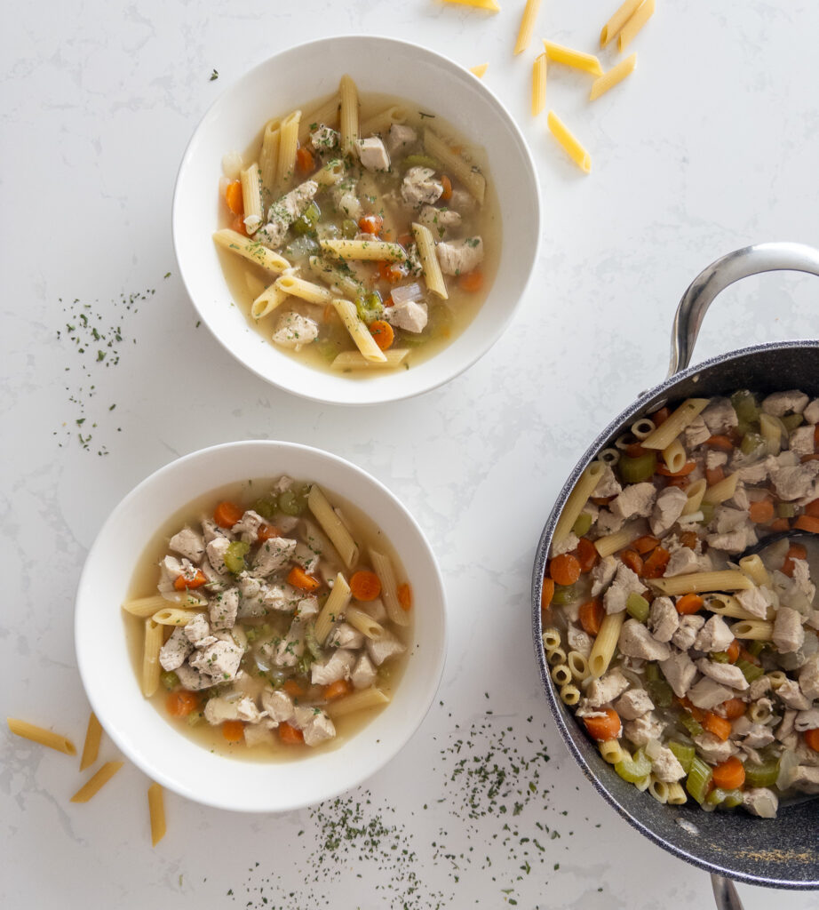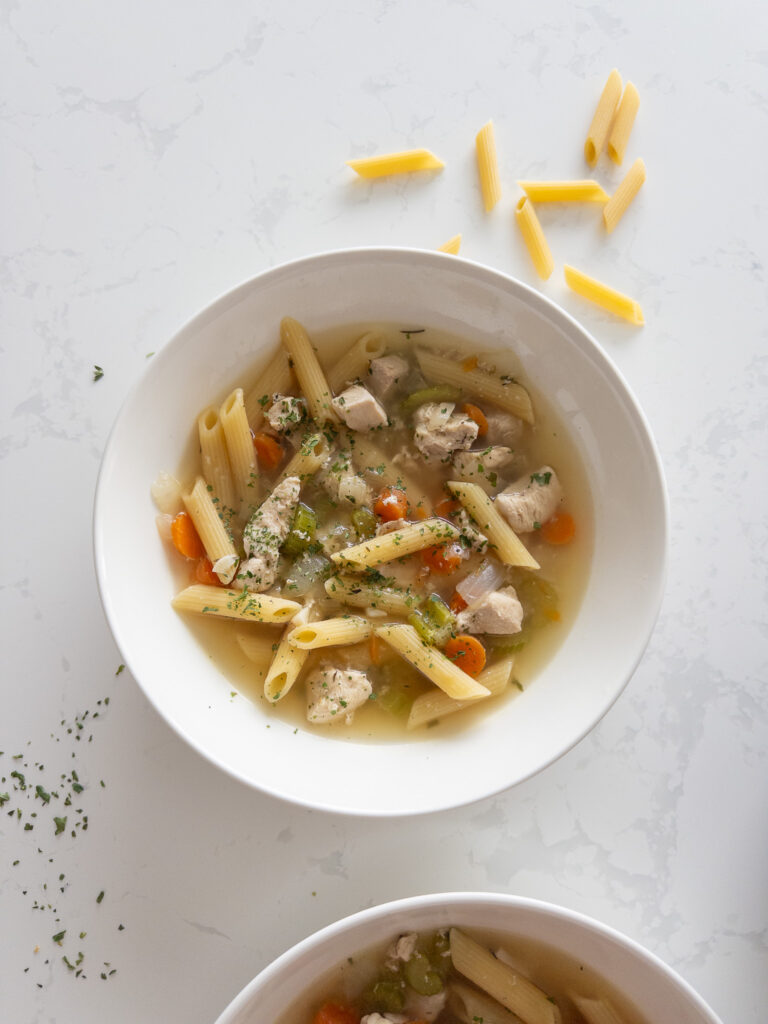 The key to an amazing chicken noodle soup is simplicity and balance. Using lean chicken breast keeps the protein high while a mix of onions, carrots, and celery adds natural sweetness and depth. The herbs bring warmth and richness, and the pasta soaks up all that delicious broth for the perfect texture.