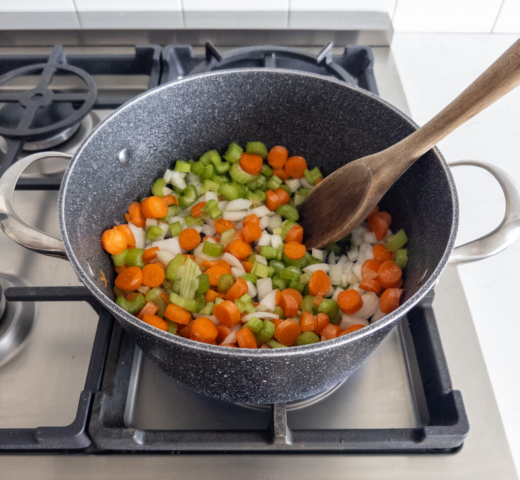 • Add onion, carrots, celery, and garlic; sauté for 2-3 minutes, just until softened.