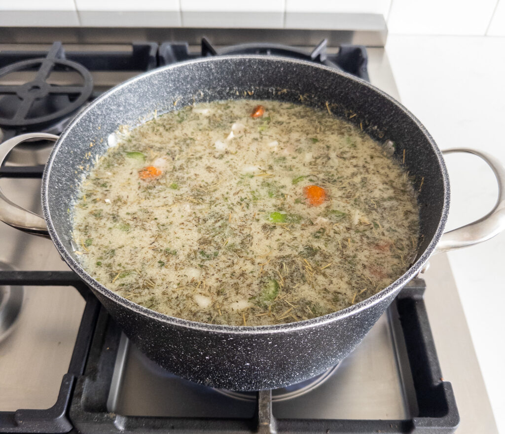 • Add chicken breast, chicken broth, thyme, parsley, rosemary, salt, and pepper.