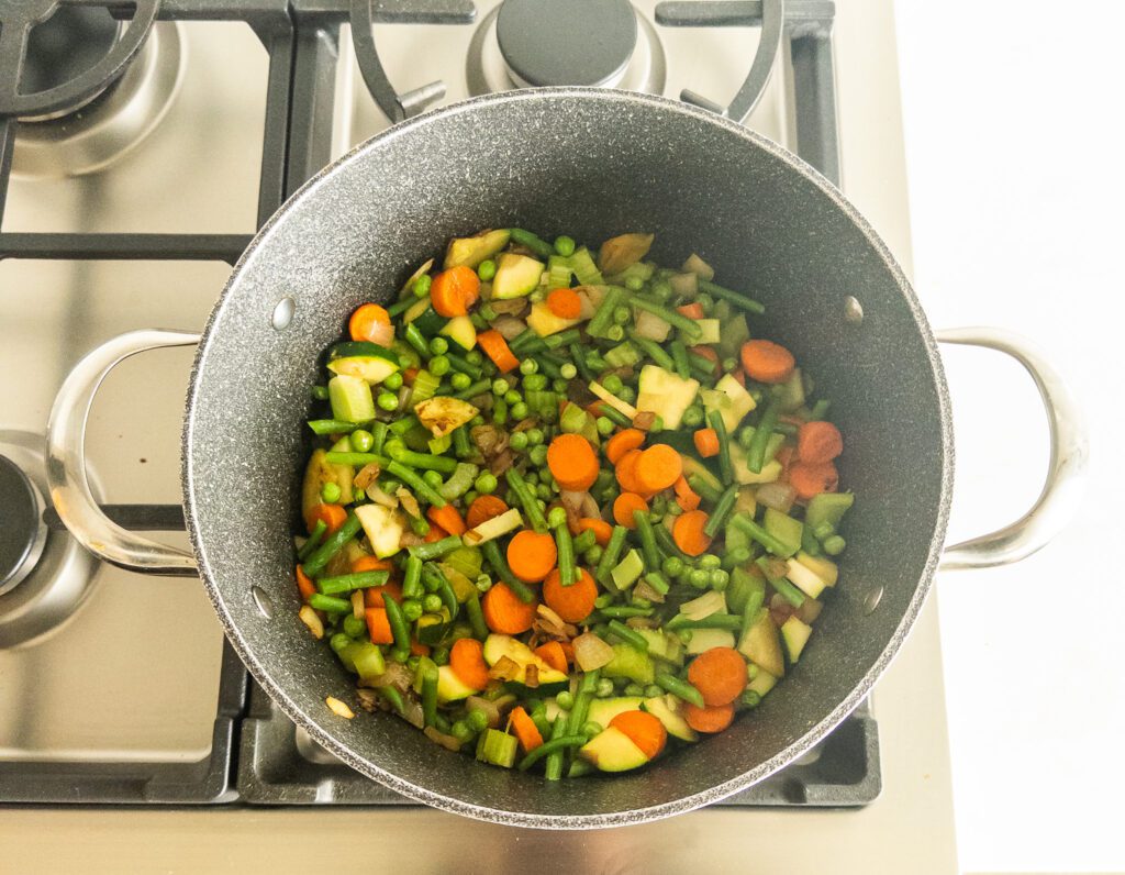 • Add diced carrots, celery, zucchini, green beans, and peas to the pot. Cook for 5-7 minutes until vegetables are slightly softened.