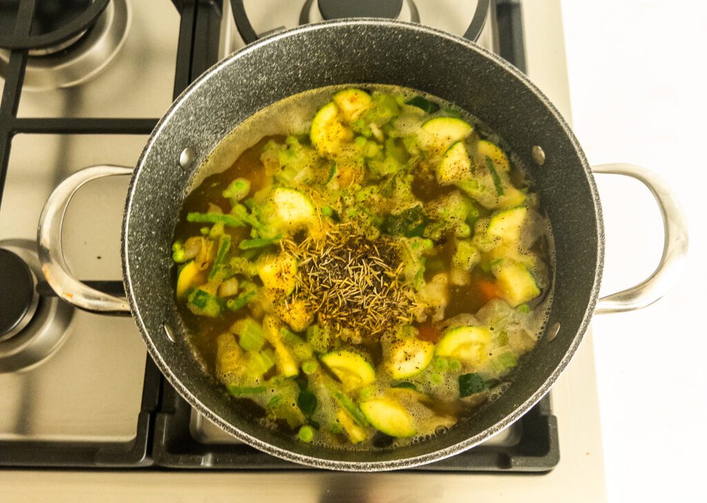 • Stir in dried thyme and rosemary. Season with salt and pepper to taste. Allow the soup to simmer for 15-20 minutes until vegetables are tender.