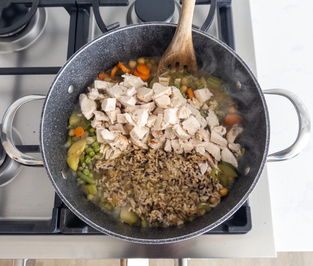 Stir in cubed cooked chicken and cooked brown rice to the soup. Let it simmer for an additional 5 minutes to heat through.