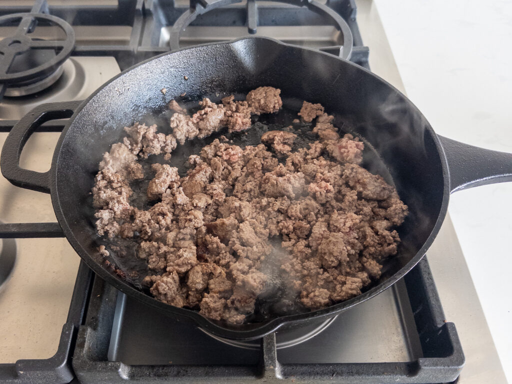 Cook Protein Layer: In a large skillet, cook ground beef over medium heat until starting to brown. Add onion, garlic, Italian seasoning, salt, and pepper. Cook for 3–4 minutes until onion softens.