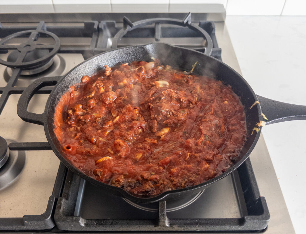• Make Tomato Sauce: Stir in crushed tomatoes, tomato paste, basil, oregano, and chili flakes (if using). Simmer for 5 minutes.