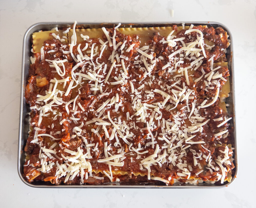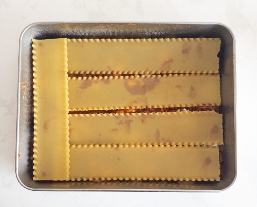 • Repeat layer (noodles, cheese, sauce). Finish with a layer of noodles, remaining sauce, and 50g (½ cup) mozzarella on top.
