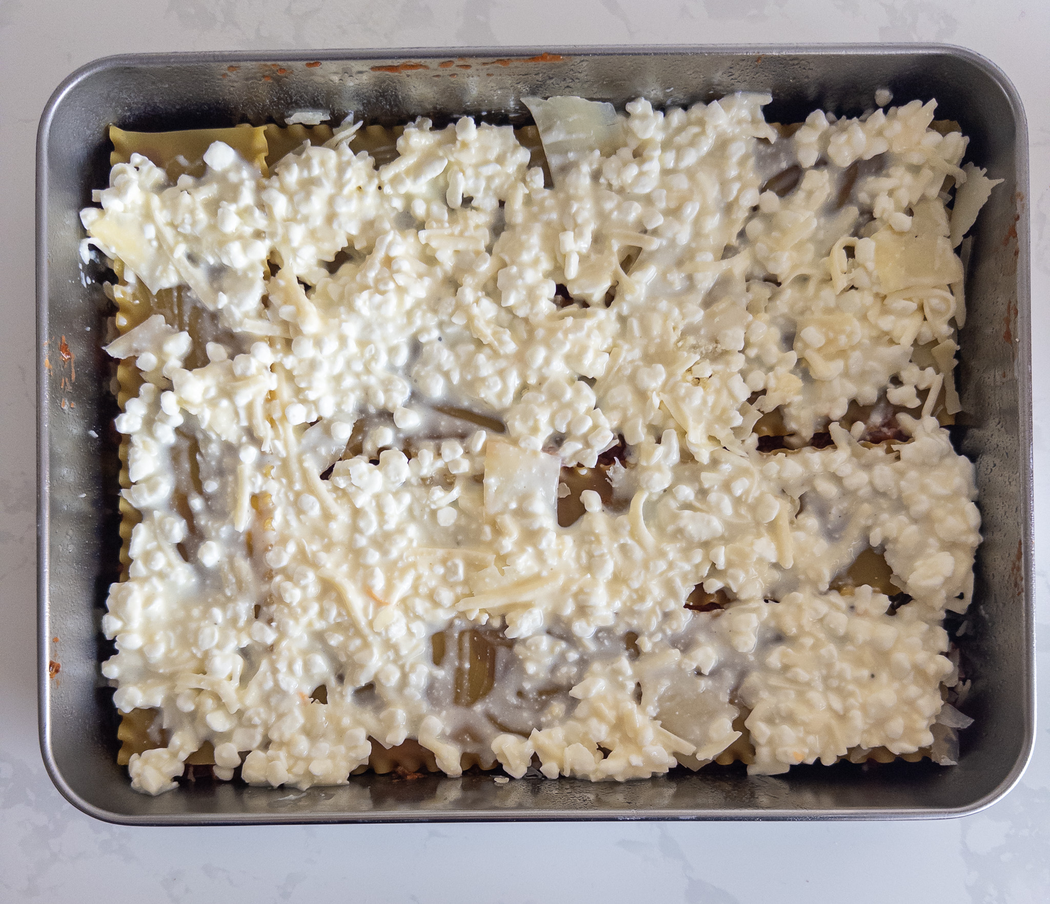 Assemble Lasagna: Spread 1 cup of the meat sauce on the bottom of the baking dish. Add a layer of oven-ready noodles. Spread ½ of the cheese mixture over the noodles. Add 1½ cups of meat sauce on top.