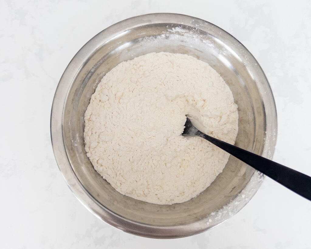 • In a large bowl, whisk together flour, protein powder, baking powder, and salt.