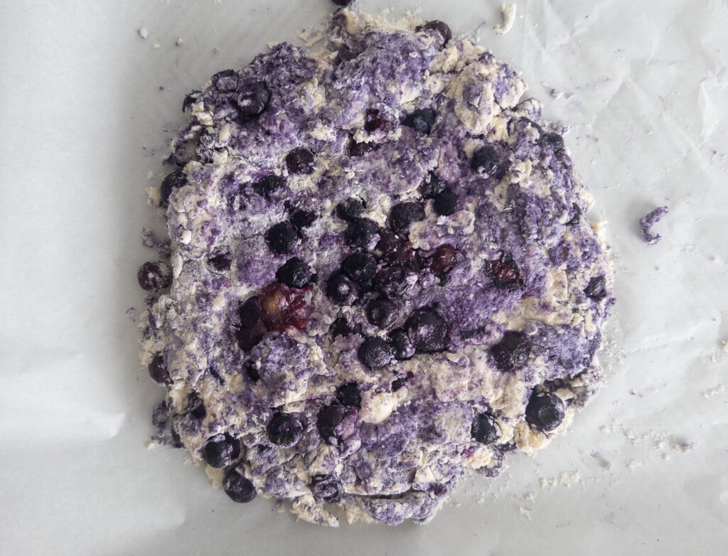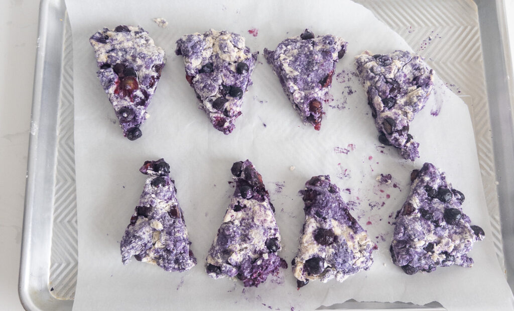 Turn the dough onto a lightly floured surface and shape it into a circle about 1-inch thick. Cut the circle into 8 wedges (like a pizza) and place them on the prepared baking sheet.