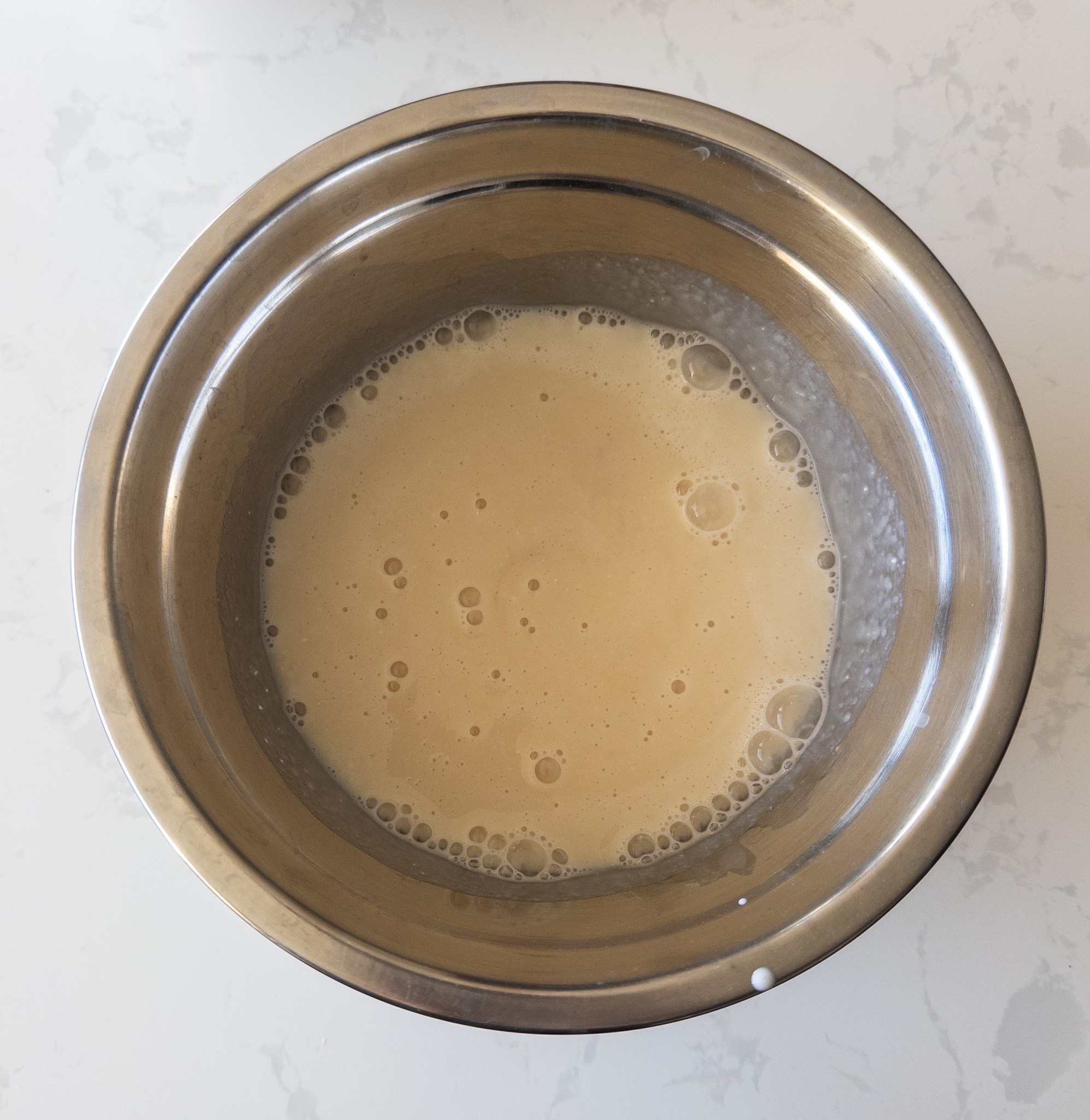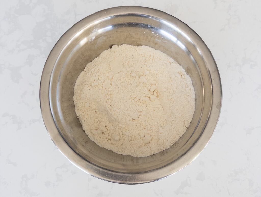 In a large bowl, combine the flour, vanilla protein powder, zero-calorie sweetener, baking powder, baking soda, and salt. Whisk until well combined.