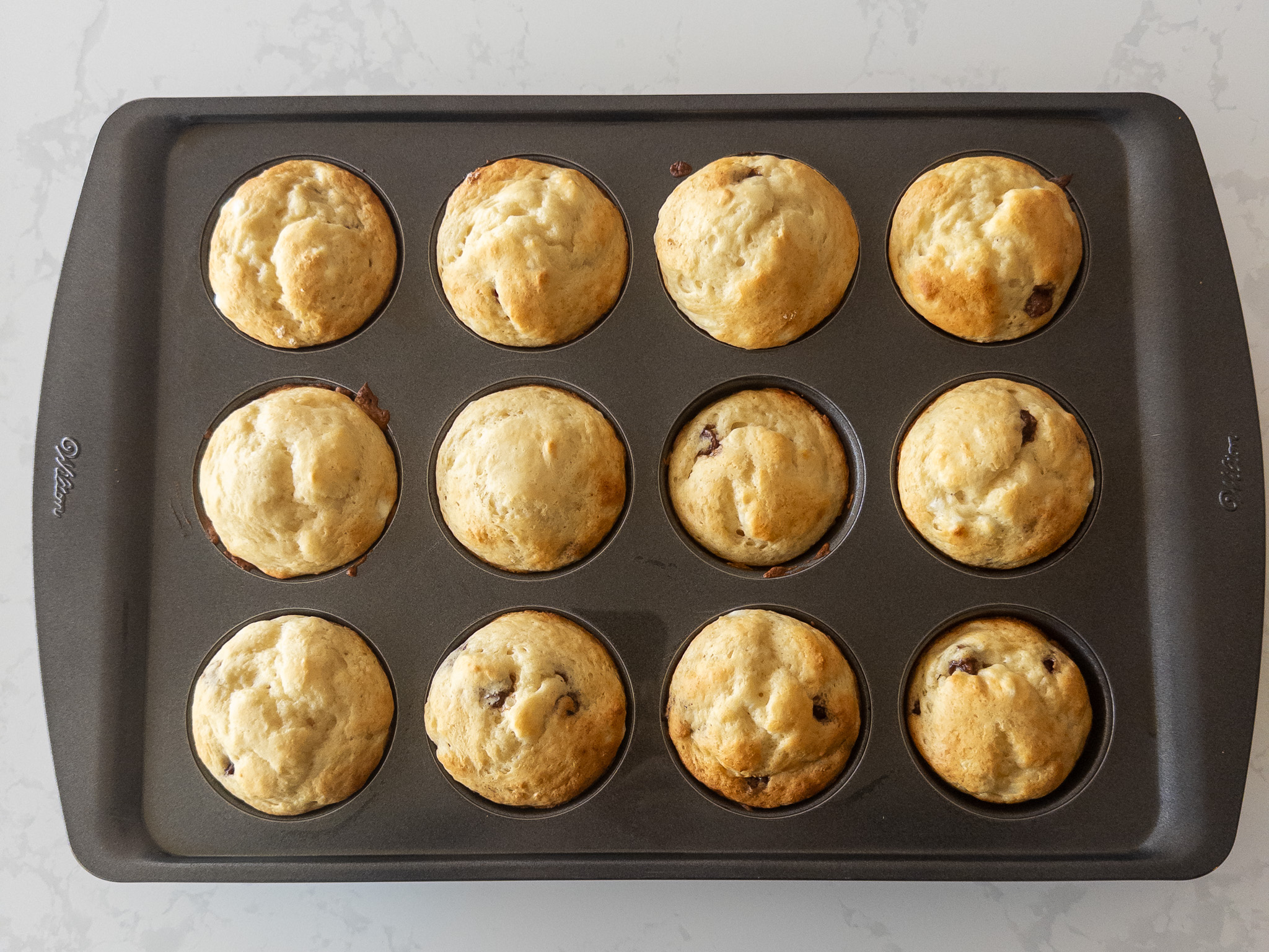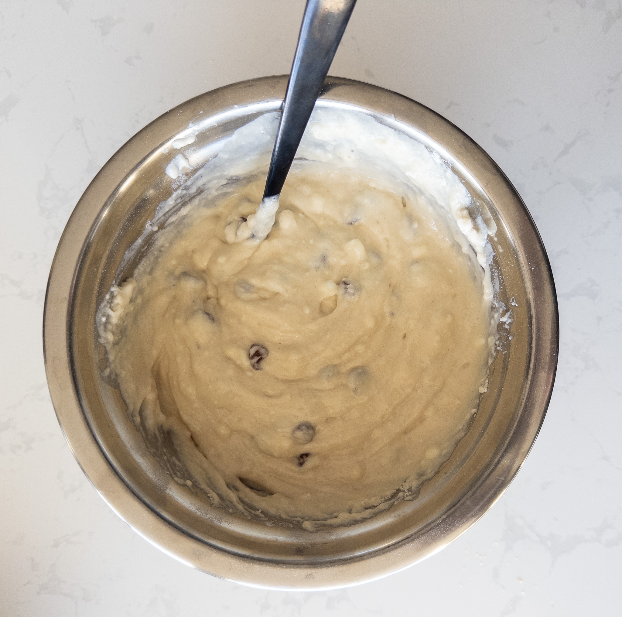 Pour the wet ingredients into the dry ingredients and mix until just combined. Do not overmix. Gently fold in the chocolate chips.