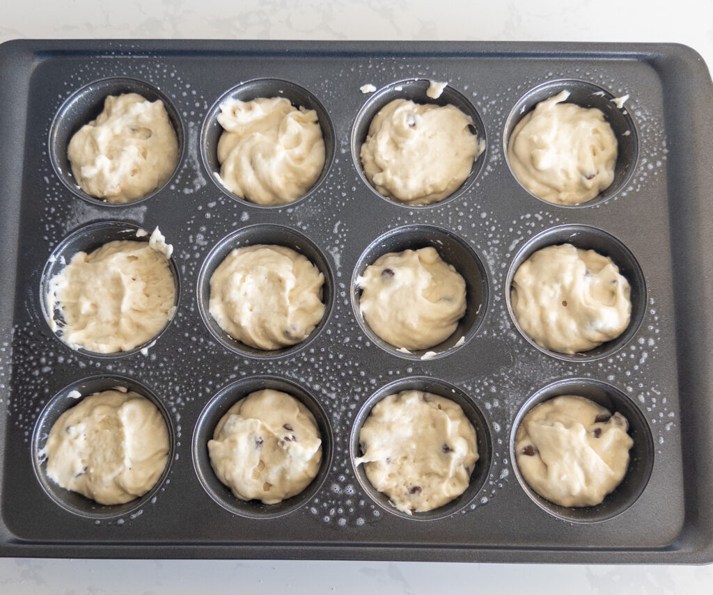 Divide the batter evenly among the muffin cups, filling each about 2/3 full.