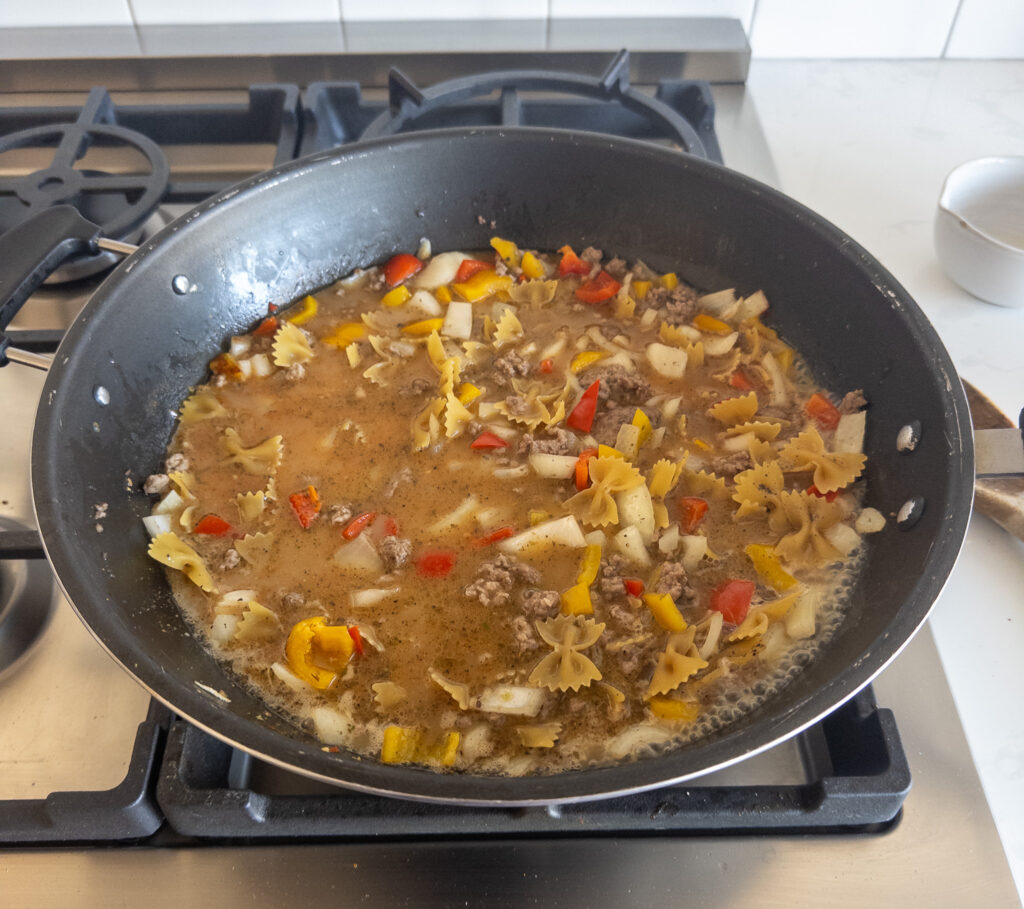 Stir in the pasta, beef broth, almond milk, Worcestershire sauce, Italian seasoning, paprika, salt, and pepper. Bring the mixture to a boil.