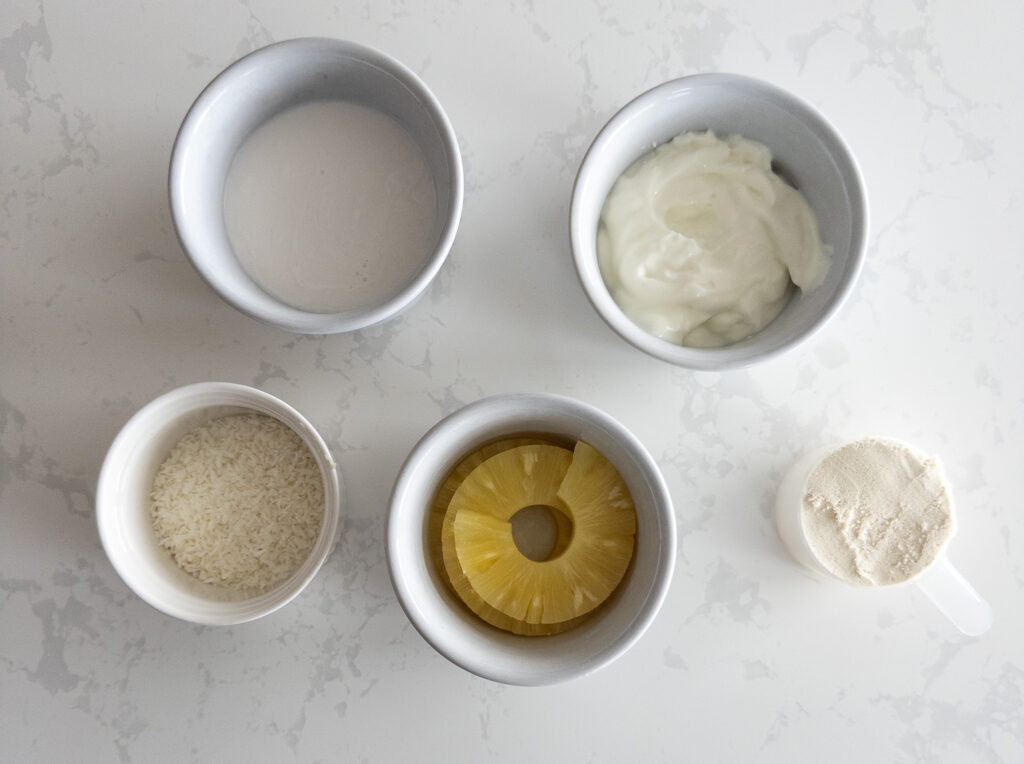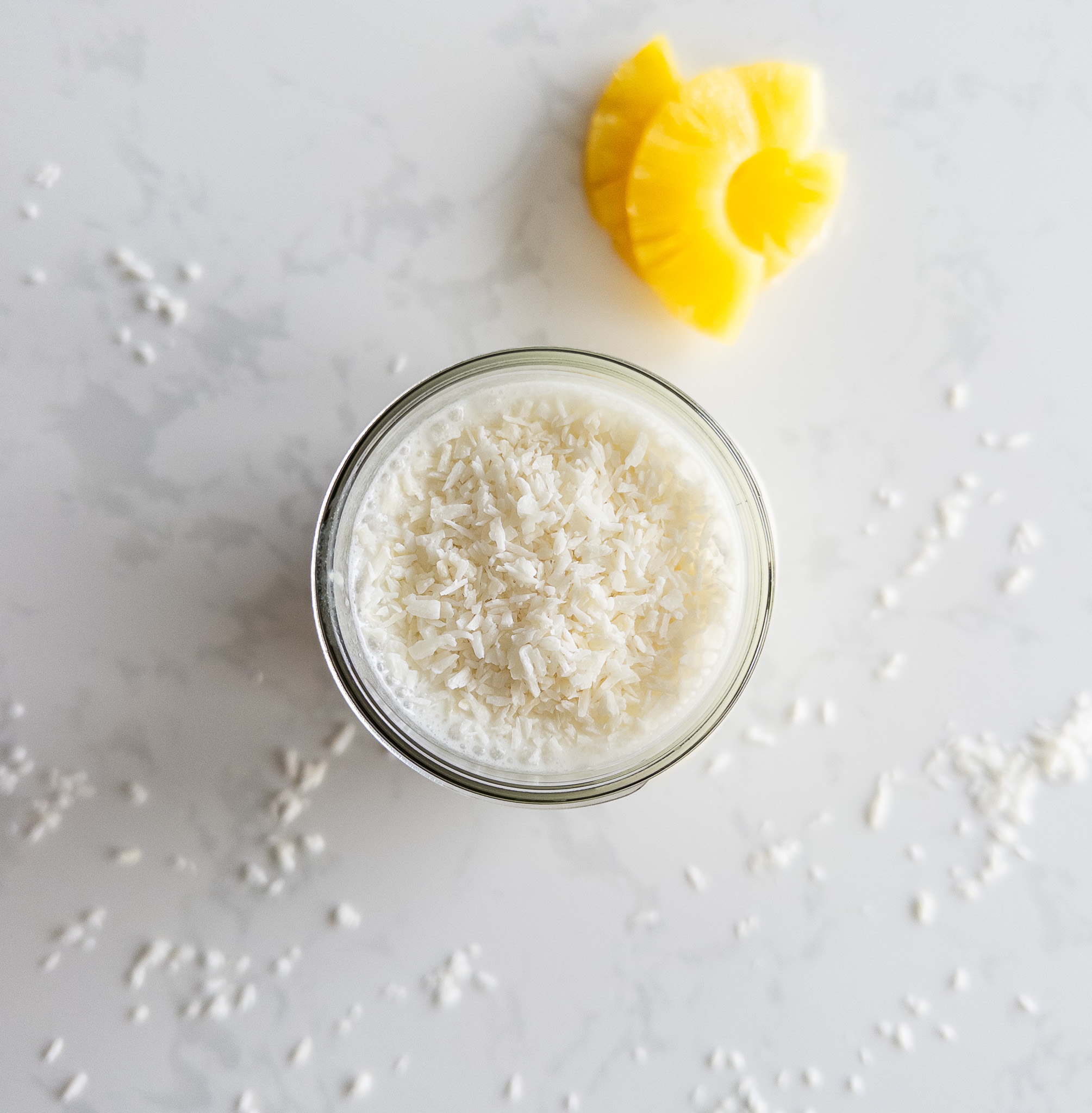 • Pour into a glass and garnish with extra shredded coconut or a pineapple wedge if desired (not included in macros)
