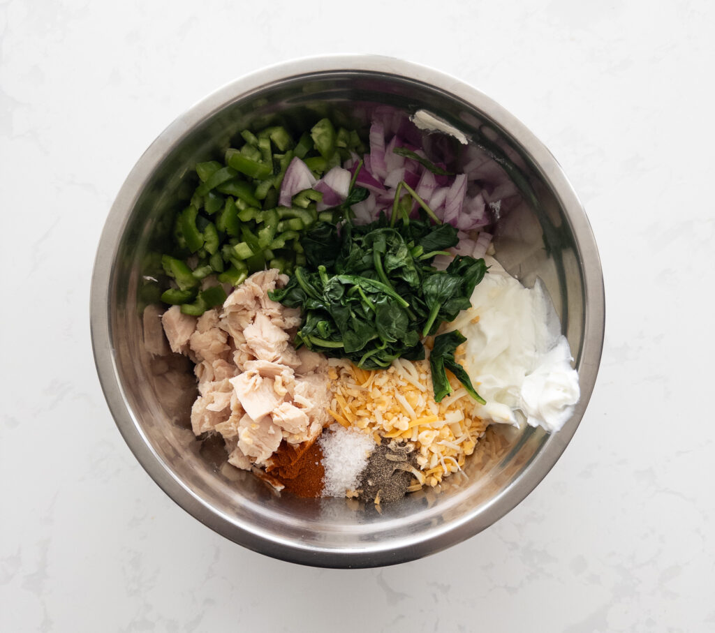 • In a large mixing bowl, combine the shredded chicken, low-fat cream cheese, 75g reduced-fat cheddar cheese, diced jalapeños, non-fat Greek yogurt, steamed cauliflower rice, wilted spinach, red onions, garlic, paprika, salt, pepper, hidden valley ranch powder (if using, optional), cayenne pepper (if using, optional) and the large egg. Stir until all ingredients are well mixed and the mixture is creamy.