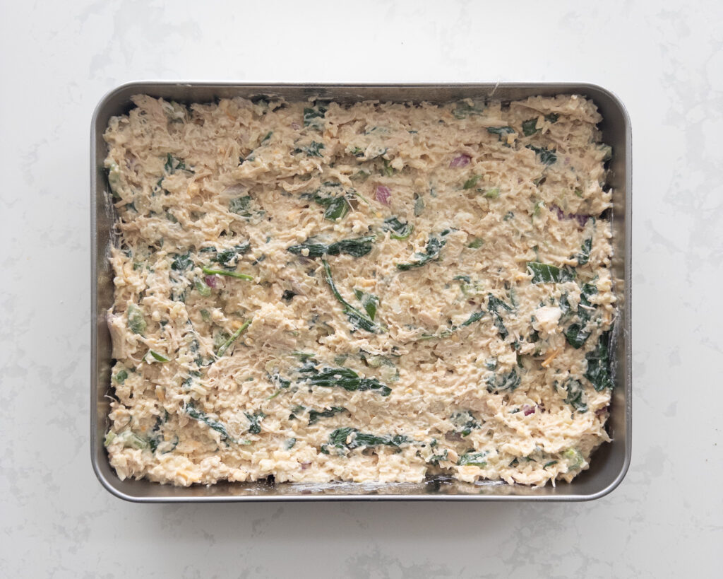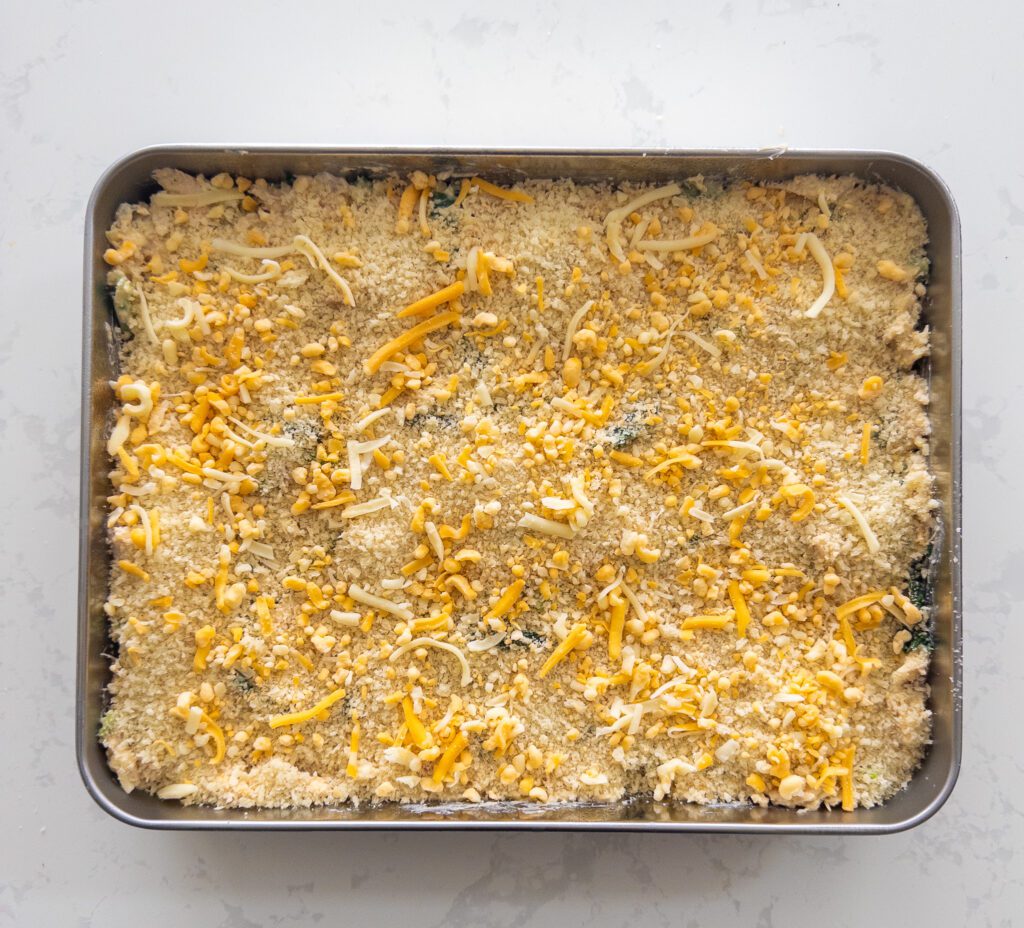 • Spread the chicken mixture evenly in the prepared baking dish.