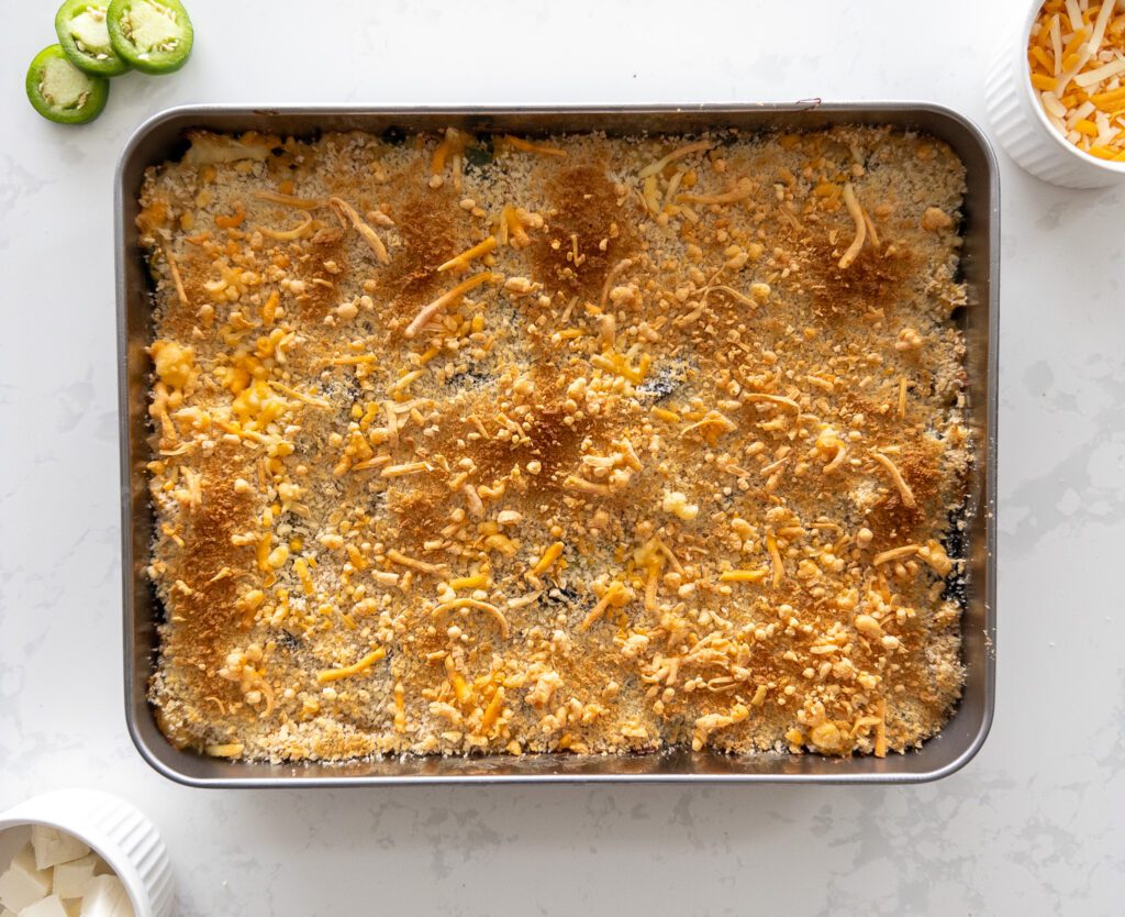 • Place the casserole in the preheated oven and bake for 28-32 minutes. Broil for 1-3 minutes or until the cheese is bubbly and the topping is golden brown.
