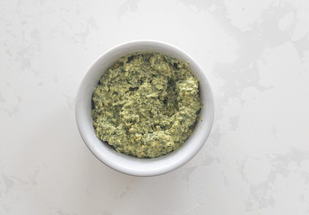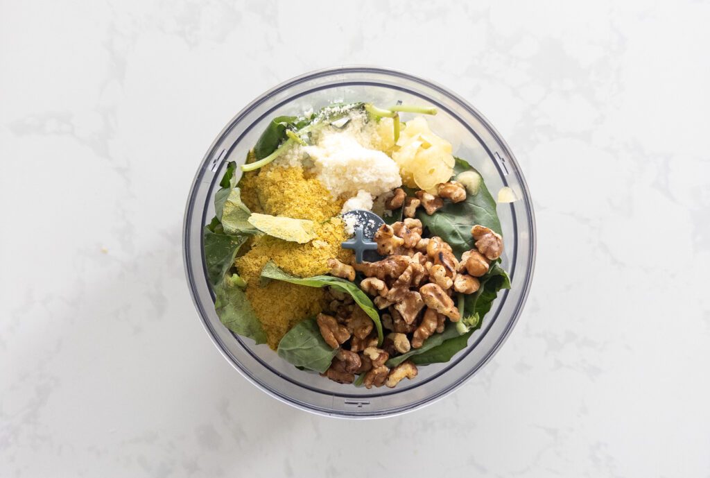 - Nutritious and Light: By incorporating Greek yogurt and nutritional yeast, we’ve boosted the protein content and added a creamy texture without the extra calories from traditional pesto ingredients like pine nuts, excessive oil and extra cheese.