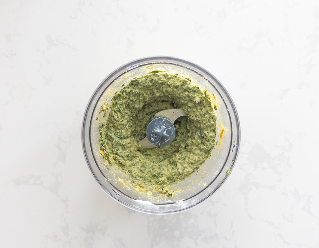 While the food processor is running, slowly stream in the olive oil until the pesto reaches your desired consistency- see recipe note. You may need to scrape down the sides of the bowl with a spatula and blend again to ensure everything is well mixed.