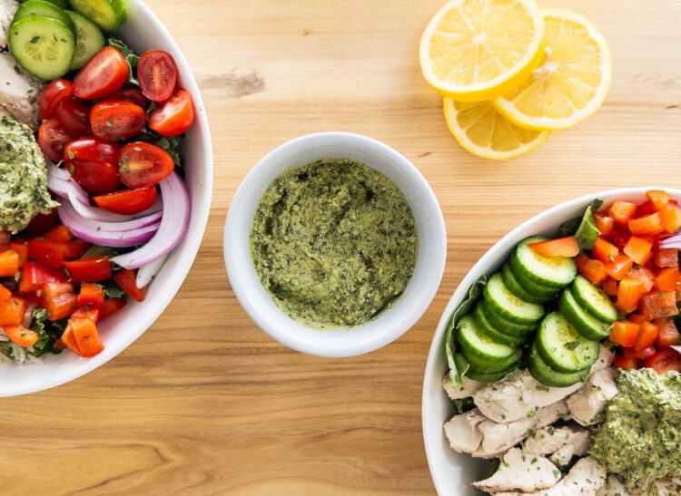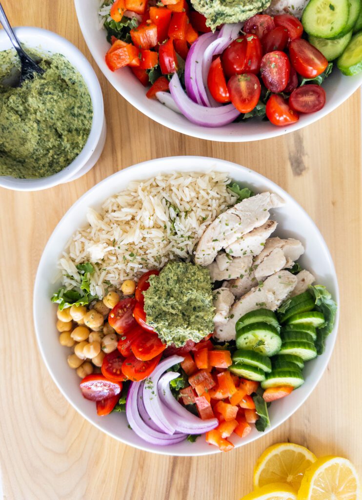 This Pesto is the Star of one of my favorite meals- my Mediterranean Pesto Chicken Bowls!