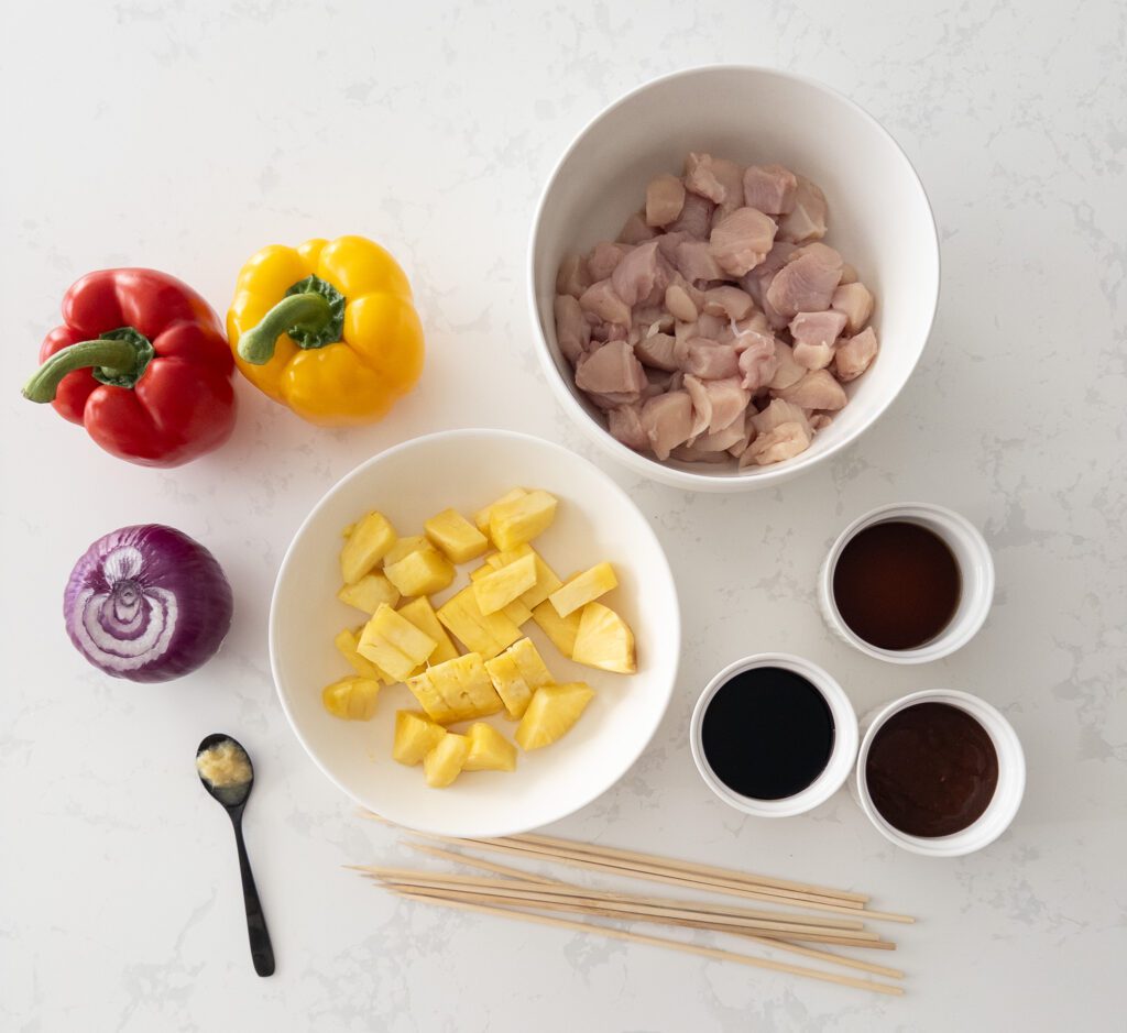 Assemble the Skewers: Thread the marinated chicken, pineapple chunks, bell pepper, and red onion onto the skewers, alternating the ingredients.