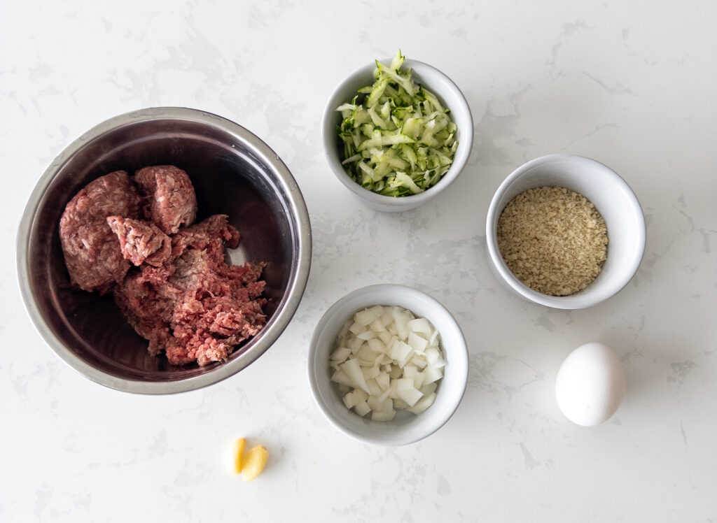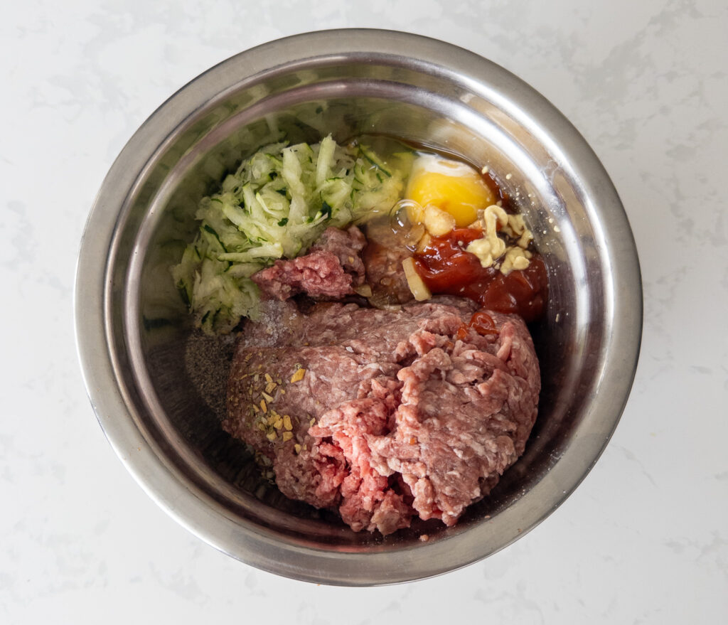 • In a large mixing bowl, combine the ground beef, grated zucchini, onion, garlic, egg, breadcrumbs, Worcestershire sauce, ketchup, Dijon mustard, Italian seasoning, salt, and pepper. Mix until just combined.