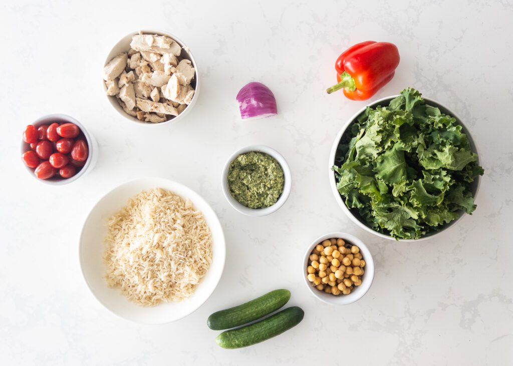 Divide the cooked rice (75g per bowl), mixed vegetables (50g cherry tomatoes, 40g cucumbers, 40g bell peppers, 15g red onions per bowl), sliced chicken breast (87.5g per bowl), chickpeas (40g per bowl), and kale (30g per bowl) evenly among four serving bowls.