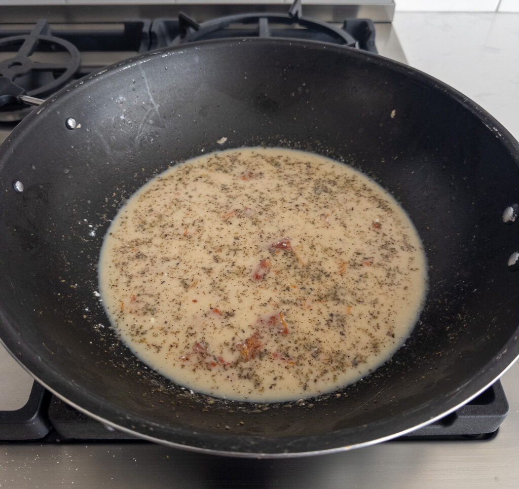 In the same skillet, add the minced garlic and cook for about 1 minute until fragrant. Stir in the chopped sun-dried tomatoes, oregano, red pepper flakes, Italian seasoning, onion powder, and paprika. Add 180ml of chicken broth, almond milk, and the light cream cheese, stirring until the cream cheese melts and combines into a smooth sauce.
