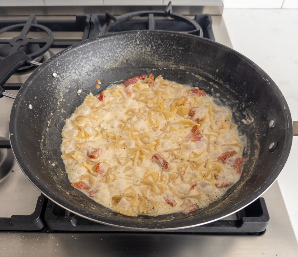 • Add the pasta directly to the skillet, ensuring it’s submerged in the sauce. Cover and simmer on low heat for 10-12 minutes, stirring occasionally. If the pasta absorbs too much liquid, add additional broth as needed, 60ml (¼ cup) at a time, until the pasta is cooked to an al dente texture.
