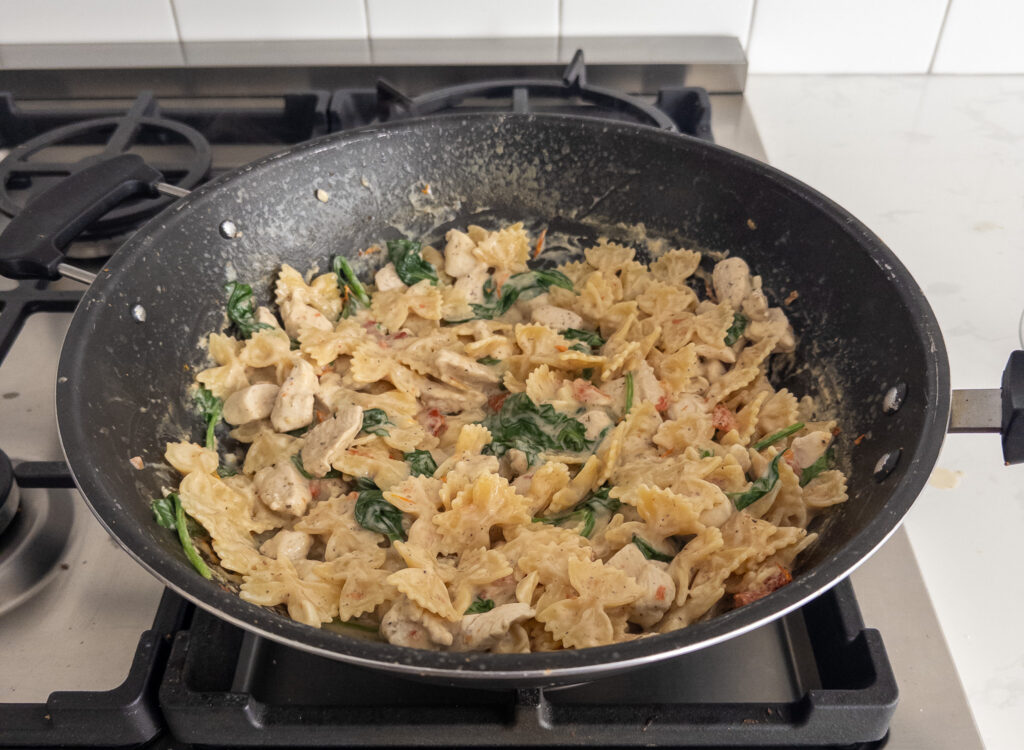 • Return the chicken to the skillet and add the fresh spinach. Stir until the spinach wilts into the sauce and the chicken is coated.