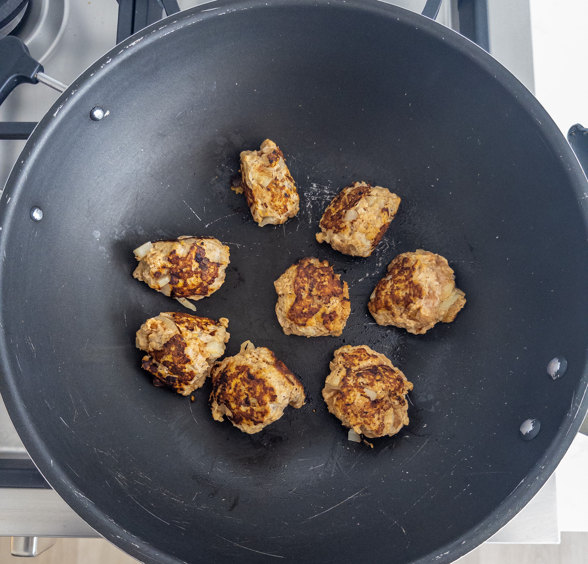 Heat the olive oil in a large skillet over low-medium heat. Add the meatballs and cook until browned on all sides and cooked through, about 12-14 minutes. If the meatballs are browning too quickly on the outside but remaining uncooked in the center, cover the pan with a lid part way through cooking. You may need to do this in batches to avoid overcrowding the skillet.