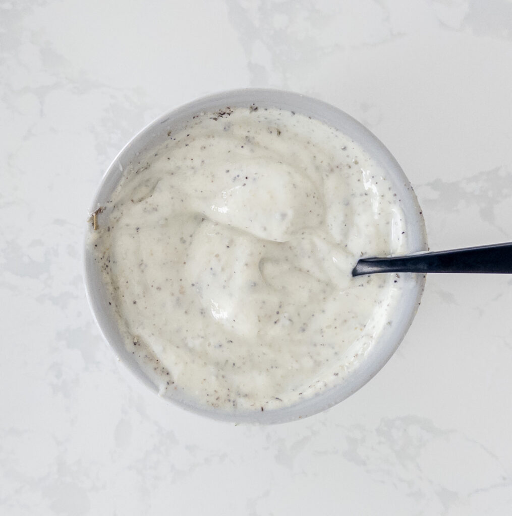 In a small bowl, combine the Greek yogurt, fresh sage, lemon juice, garlic powder, salt, and black pepper. Mix until well combined.