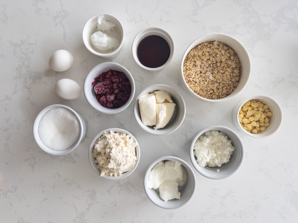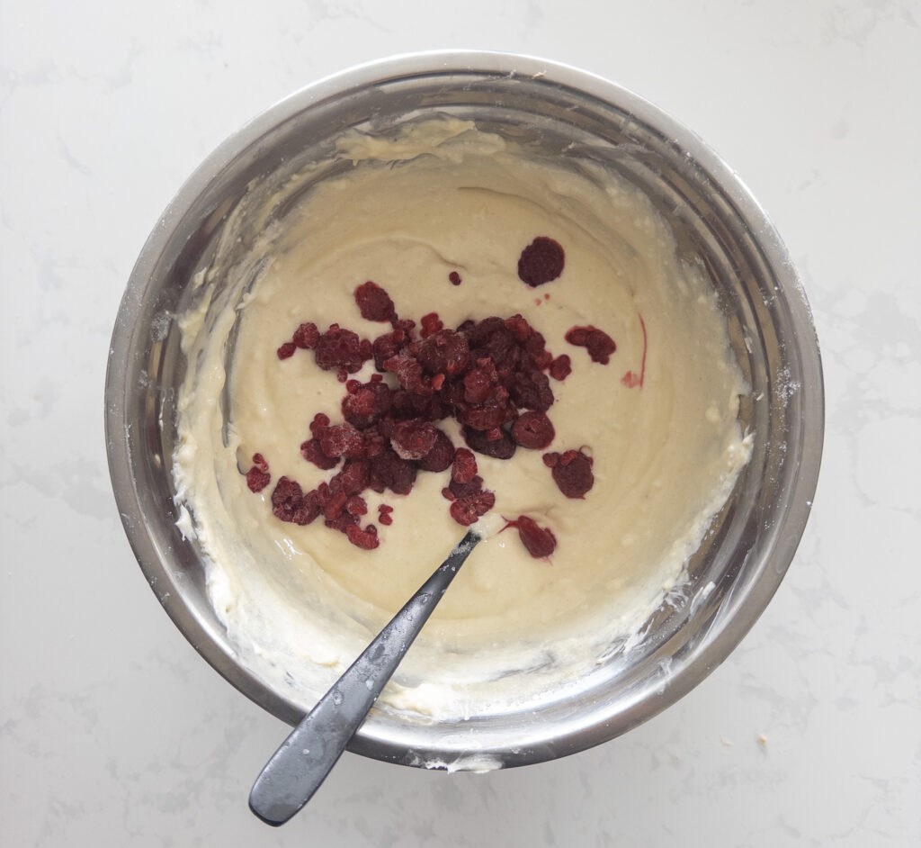 Melt white chocolate chips and mix into the filling. If you prefer, you can also fold in unmelted white chocolate pieces for a bit of texture. Microwave raspberries for 45-60 seconds and fold in.