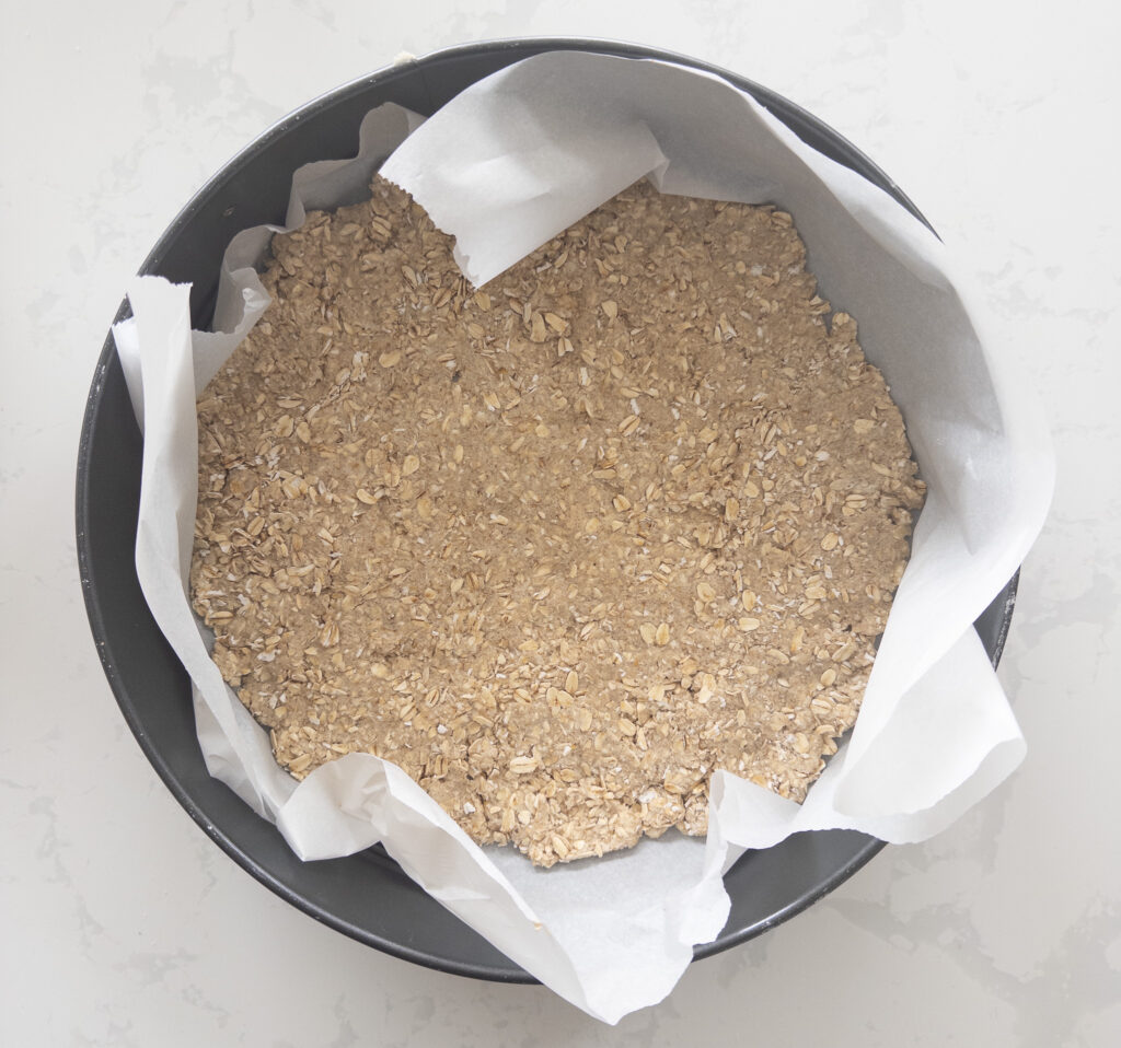 Press the crust mixture evenly into the bottom of the prepared pan. Set aside.