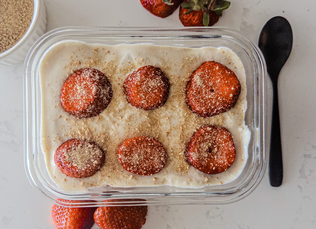 Garnish with freshly chopped strawberries and a sprinkle of graham cracker crumbs for a delightful finish.