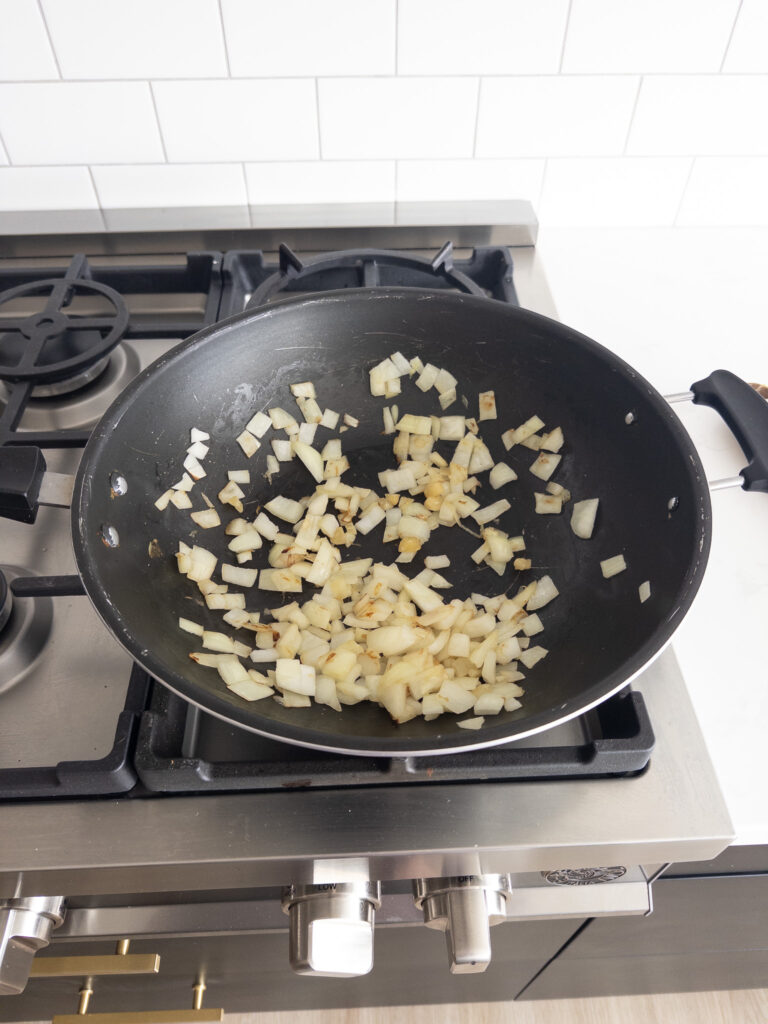 While the sweet potatoes are roasting, heat olive oil in a skillet over medium heat. Add diced onion and cook until translucent, about 5 minutes. Add minced garlic and cook for an additional 1 minute.