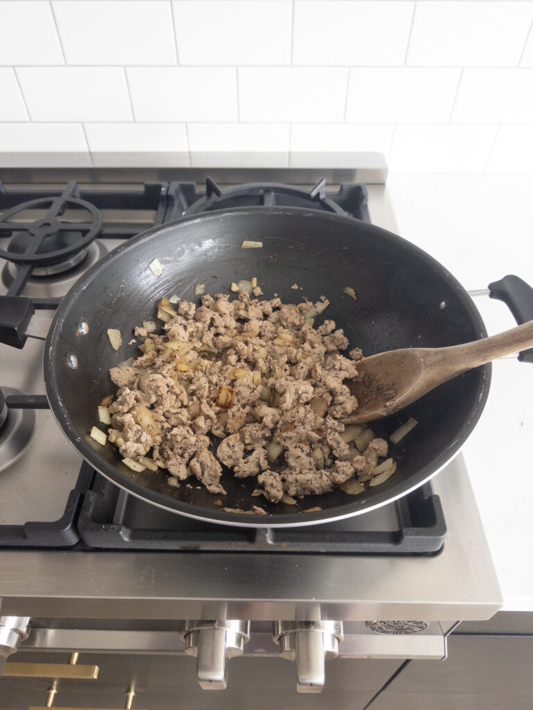 • Add the ground turkey to the skillet. Cook until browned and fully cooked, breaking it up with a spoon as it cooks. Season with dried sage, dried thyme, salt, and pepper.