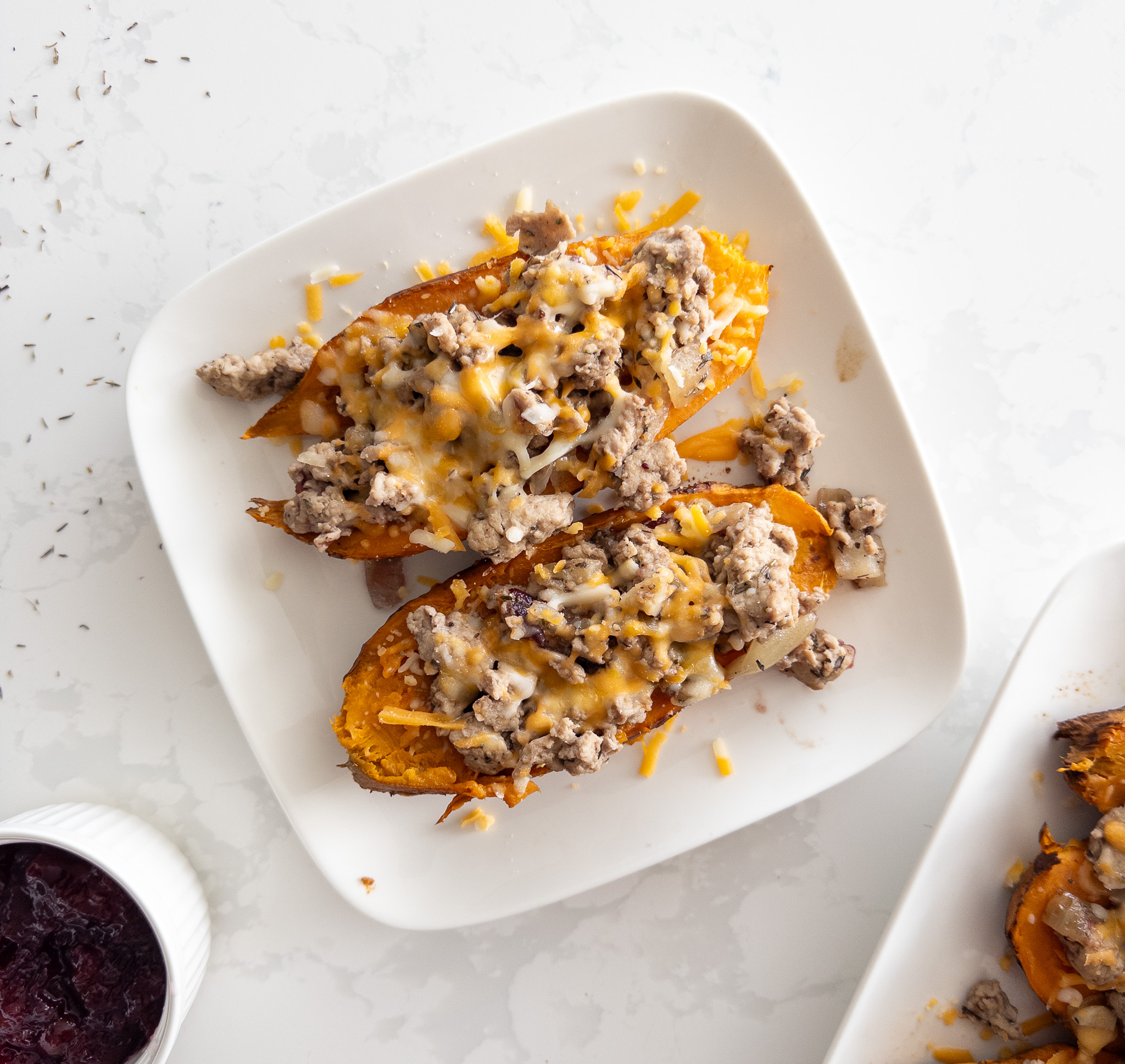 • Sprinkle shredded cheddar cheese over the top of each stuffed sweet potato.