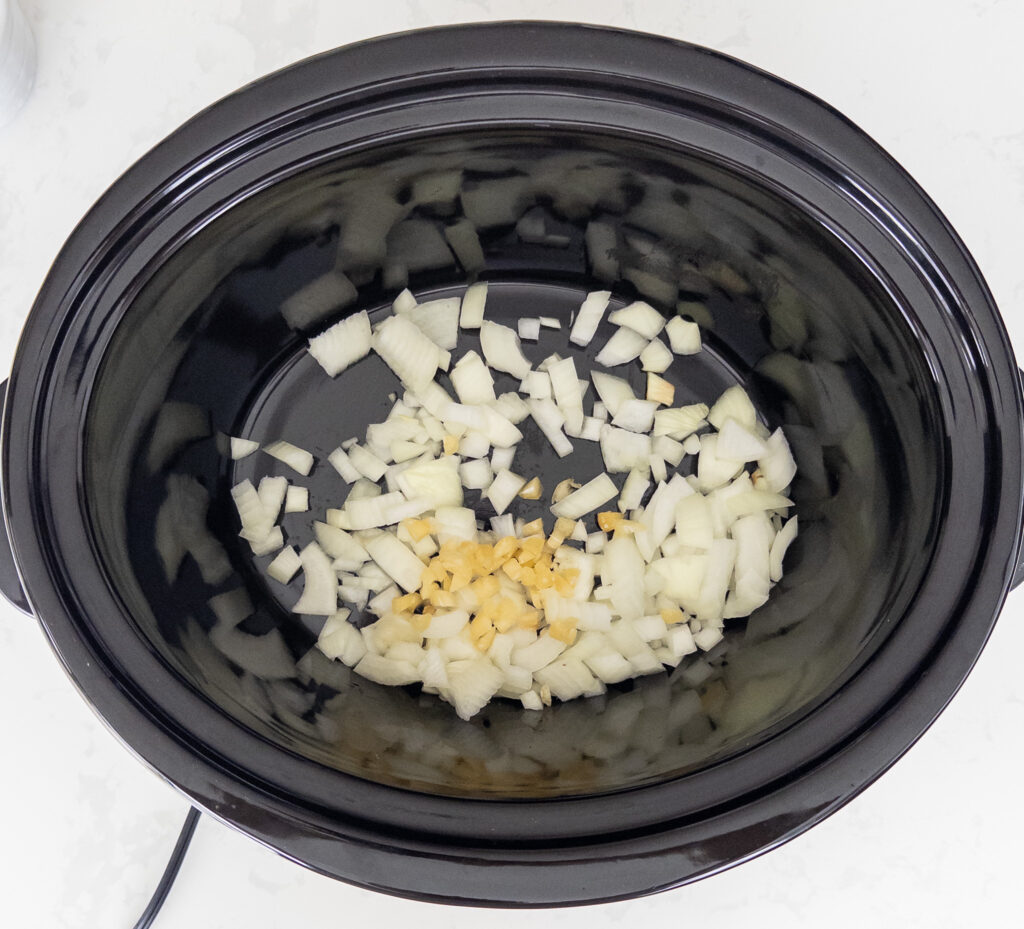 Add the diced onion and minced garlic to the bottom of the Crockpot.