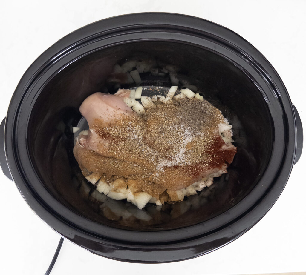 Place the chicken breasts on top of the onion and garlic. Sprinkle the cumin, oregano, chili powder, black pepper, and salt over the chicken.
